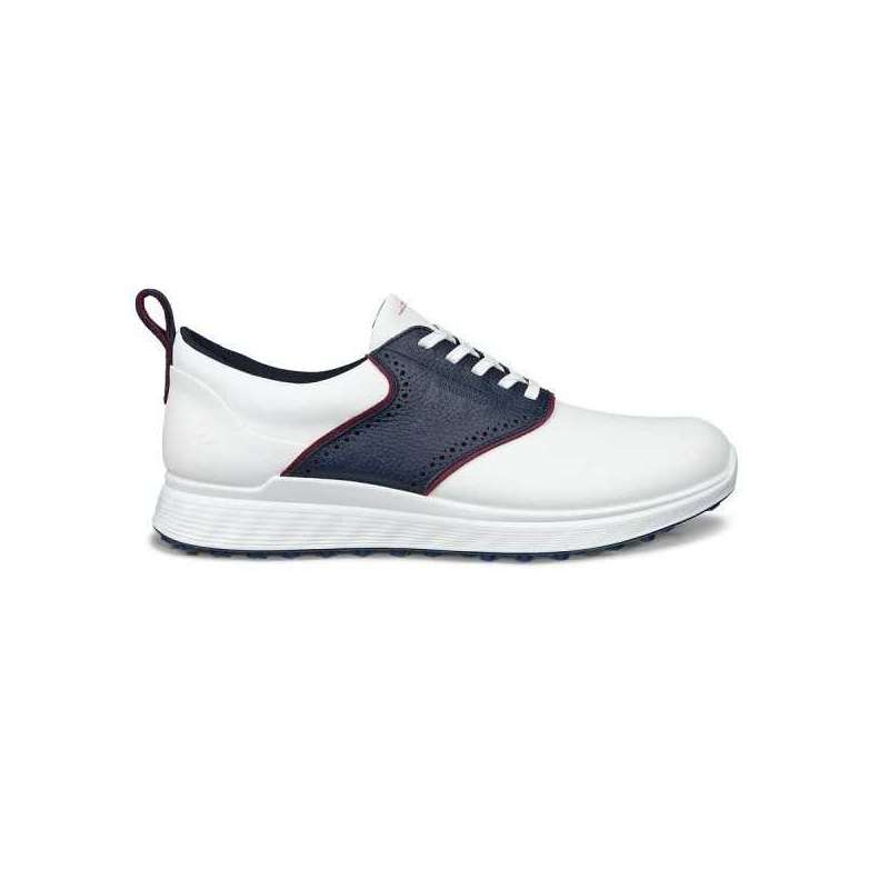 ECCO M GOLF S-THREE to klasyczne wodoodporne buty golfowe typu saddle w nowoczesnym wydaniu. Ich ponadczasowa estetyka to efekt połączenia podeszw w stylu sneakersów z nowoczesnymi akcentami i zaawansowaną wodoodporną technologią ECCO. Wykonane z wysokogatunkowej, oddychającej skóry ECCO, są niezwykle przewiewne i świetnie wyglądają. Te eleganckie męskie buty hybrydowe wyróżnia kontrastująca część sznurowana z kolorową warstwą spodnią, perforacjami i logo ECCO. Wodoodporna membrana ECCO-TEX zapewnia komfort, chroniąc stopę przed wilgocią nawet w niesprzyjających warunkach. X-TENSA INVISIBLE TECHNOLOGY zwiększa stabilność, a podeszwa E-DTS® z około setką listew trakcyjnych z TPU z 800 kątami trakcji zapewnia doskonałą przyczepność